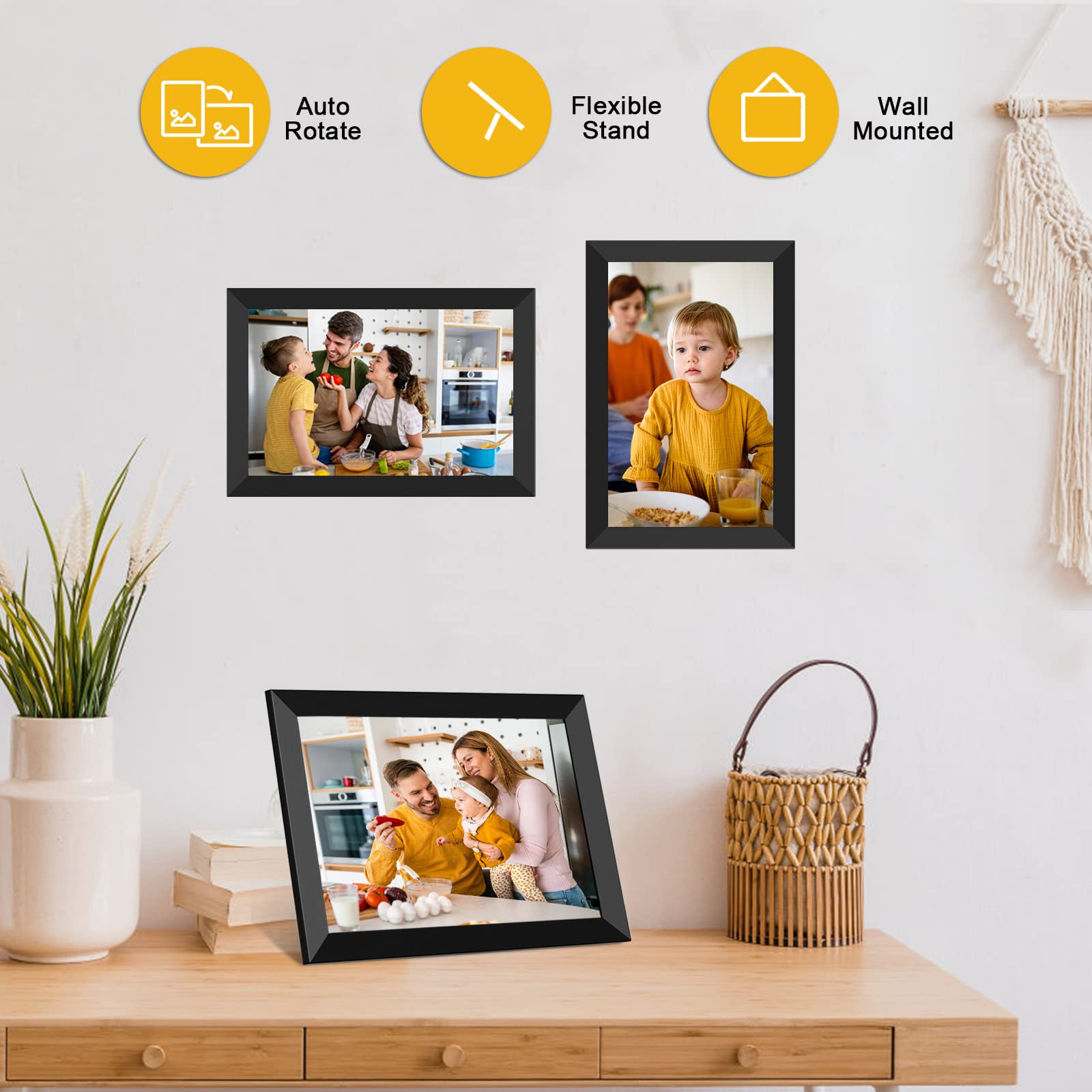 - Wall-Mountable: Designed for easy mounting on walls, ideal for living rooms, offices, or any space where you want a digital photo display.